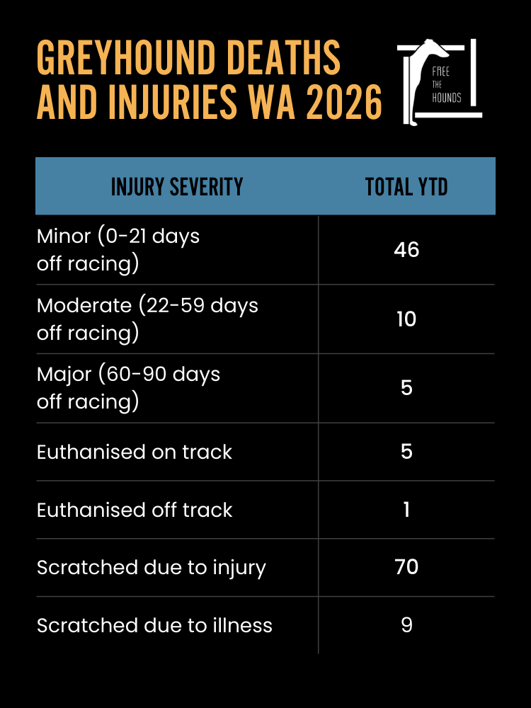 Since 2015, Greyhound racing in Western Australia has killed more than 1,550 healthy dogs. Every one of us has a part to play in ending greyhound racing in Western Australia.